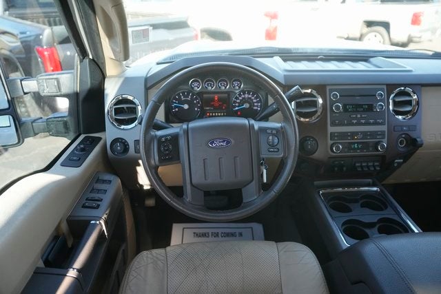 This 2011 Ford F-250SD Lariat in Oxford White comes with the following features: Power Stroke 6.7L V8 DI 32V OHV Turbodiesel TorqShift 6-Speed Automatic with Overdrive 4WD GVWR: 10,000 lb Payload Package, Lariat Interior Package (Rear-View Camera and Remote Start System), Order Code 608A, F-250 SuperDuty Lariat, 4D Crew Cab, Power Stroke 6.7L V8 DI 32V OHV Turbodiesel, TorqShift 6-Speed Automatic with Overdrive, 4WD, Oxford White, Adobe Leather, 4-Wheel Disc Brakes, 5 Chrome Tubular Step Bars, 9 Speakers, ABS brakes, Adjustable pedals, Air Conditioning, Alloy wheels, AM/FM radio: SIRIUS, Auto-dimming Rear-View mirror, Automatic temperature control, Bodyside Molding, Brake assist, Bumpers: chrome, CD player, Compass, Delay-off headlights, Driver door bin, Driver vanity mirror, Dual front impact airbags, Dual front side impact airbags, Electronic Stability Control, Engine Block Heater, Extra Heavy-Duty 200-Amp Alternator, Front anti-roll bar, Front Bucket Seats, Front Center Armrest, Front dual zone A/C, Front fog lights, Front reading lights, Fully automatic headlights, Heated door mirrors, Illuminated entry, Leather steering wheel, Low tire pressure warning, Outside temperature display, Overhead airbag, Overhead console, Panic alarm, Passenger door bin, Passenger vanity mirror, Power door mirrors, Power driver seat, Power passenger seat, Power steering, Power windows, Premium Leather Seating Surfaces 40/Console/40, Radio data system, Radio: Premium AM/FM Stereo w/Single-CD/MP3 Player, Rear Parking Sensors, Rear reading lights, Rear seat center armrest, Rear step bumper, Remote keyless entry, Satellite Radio, Security system, Speed control, Split folding rear seat, Steering wheel mounted audio controls, Tachometer, Tailgate Step & Handle w/TailGate Assist, Telescoping steering wheel, Tilt steering wheel, Traction control, Trip computer, Turn signal indicator mirrors, Upfitter Switches (4), and Variably intermittent wipers.