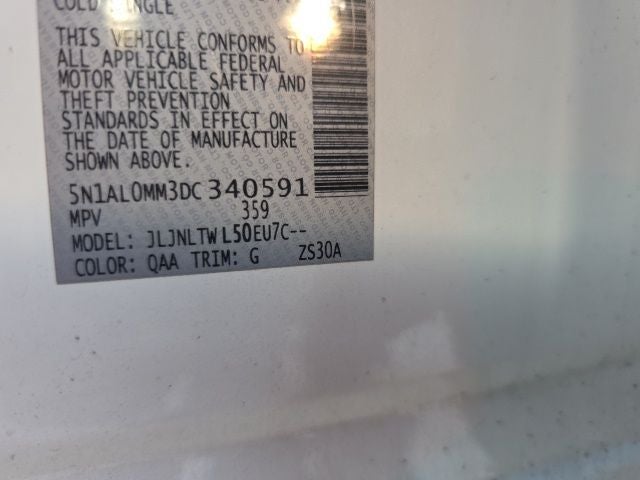 This 2013 INFINITI JX35 in Moonlight White comes with the following features: 3.5L V6 Sport-Tuned CVT AWD Premium Package (2-Way Driver's Seat Power Lumbar Support, Around View Monitor w/Front & Rear Sonar System, Auto-Dimming Inside Mirror, Dual Occupant Memory System, Enhanced Intelligent Key Memory, Entry & Exit Assist, INFINITI Voice Recognition, Outside Mirrors w/Reverse Tilt-Down Feature, and Radio: INFINITI Hard Drive Navigation System), 18 Split 5-Spoke Aluminum-Alloy Wheels, 3rd row seats: bench, 4-Wheel Disc Brakes, 5.17 Axle Ratio, 6 Speakers, ABS brakes, Air Conditioning, Alloy wheels, AM/FM radio: SiriusXM, AM/FM/CD/MP3 Audio System, Automatic temperature control, Bodyside moldings, Brake assist, Bumpers: body-color, CD player, Delay-off headlights, Driver door bin, Driver vanity mirror, Dual front impact airbags, Dual front side impact airbags, Electronic Stability Control, Exterior Parking Camera Rear, Four wheel independent suspension, Front anti-roll bar, Front Bucket Seats, Front Center Armrest w/Storage, Front dual zone A/C, Front fog lights, Front reading lights, Fully automatic headlights, Heated door mirrors, Heated Front Seats, Heated front seats, High intensity discharge headlights: Bi-Xenon, Illuminated entry, Leather Shift Knob, Leather steering wheel, Leather-Appointed Seats, Low tire pressure warning, Occupant sensing airbag, Outside temperature display, Overhead airbag, Overhead console, Panic alarm, Passenger door bin, Passenger vanity mirror, Power door mirrors, Power driver seat, Power Liftgate, Power moonroof, Power passenger seat, Power steering, Power windows, Radio data system, Rear air conditioning, Rear anti-roll bar, Rear reading lights, Rear seat center armrest, Rear window defroster, Rear window wiper, Reclining 3rd row seat, Remote keyless entry, Roof Rails, Security system, Speed control, Speed-sensing steering, Speed-Sensitive Wipers, Split folding rear seat, Spoiler, Steering wheel mounted audio controls, Tachometer, Telescoping steering wheel, Tilt steering wheel, Traction control, Trip computer, and Variably intermittent wipers.