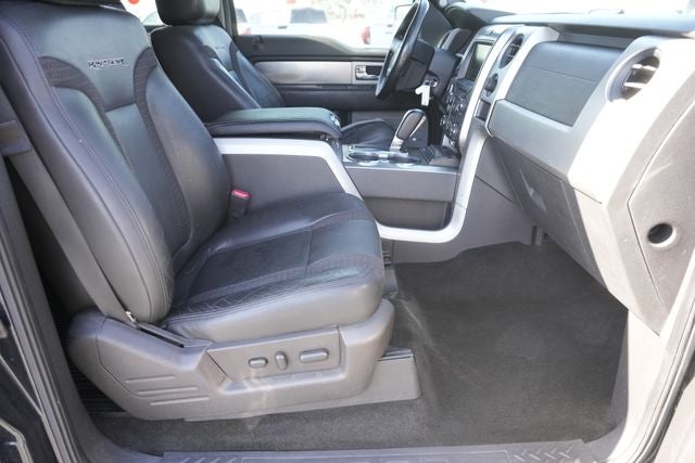 This 2014 Ford F-150 SVT Raptor in Tuxedo Black Metallic comes with the following features: 6.2L V8 EFI 16V 6-Speed Automatic Electronic 4WD Equipment Group 801A Luxury (Electronic Locking w/4.10 Axle Ratio and Navigation), GVWR: 7,450 lbs Payload Package, Raptor Luxury Package (10-Way Power Driver & Passenger Seats, Dual Electronic Automatic Temperature Control, Heated PowerFold Side Mirrors w/Memory, Heated/Cooled Driver & Passenger Seats, High-Intensity Discharge Headlamps, Memory System, Power Adjustable Pedals w/Memory, Power Tilt/Telescoping Steering Wheel, Radio: Sony Single-CD w/HD, Rear-View Camera, Remote Start, Trailer Brake Controller, and Universal Garage Door Opener), F-150 SVT Raptor, 4D SuperCrew, 6.2L V8 EFI 16V, 6-Speed Automatic Electronic, 4WD, Tuxedo Black Metallic, Black Leather, 17 Cast Aluminum Wheels, 4 Speakers, 4-Wheel Disc Brakes, 6-Way Power Adjuster (Driver's Side Only), ABS brakes, Air Conditioning, Alloy wheels, AM/FM radio: SiriusXM, AM/FM Single CD w/Clock, Auto-dimming Rear-View mirror, CD player, Compass, Delay-off headlights, Driver door bin, Driver vanity mirror, Dual front impact airbags, Dual front side impact airbags, Electronic Stability Control, Front anti-roll bar, Front Bucket Seats, Front Center Armrest, Front fog lights, Front License Plate Bracket, Front reading lights, Front wheel independent suspension, Front/Rear View Camera, Fully automatic headlights, Illuminated entry, Leather steering wheel, Low tire pressure warning, Occupant sensing airbag, Outside temperature display, Overhead airbag, Overhead console, Overhead Console w/Single Storage Bin, Panic alarm, Passenger door bin, Passenger vanity mirror, Power door mirrors, Power driver seat, Power Moonroof, Power steering, Power windows, Radio data system, Rear Parking Sensors, Rear reading lights, Rear step bumper, Rear window defroster, Remote keyless entry, SiriusXM Satellite Radio, Speed control, Speed-sensing steering, Split folding rear seat, Spray-In Bed Liner (Pre-Installed), Steering wheel mounted audio controls, Tachometer, Tailgate Step, Telescoping steering wheel, Tilt steering wheel, Traction control, Trip computer, Unique Leather/Cloth Front 40/Console/40 Seats, and Variably intermittent wipers.