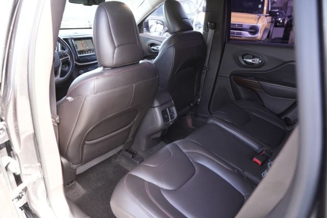This 2015 Jeep Cherokee Trailhawk in Granite Crystal Metallic Clearcoat comes with the following features: 3.2L V6 9-Speed 948TE Automatic 4WD Comfort/Convenience Group (Air Conditioning ATC w/Dual Zone Control, Humidity Sensor, No Satellite Coverage w/AK/HI, Passive Entry/Keyless Go, Power 4-Way Driver Lumbar Adjust, Power 8-Way Driver Seat, Power Liftgate, Premium Air Filter, Rear-View Auto-Dimming Mirror w/Microphone, Remote Proximity Keyless Entry, Remote Start System, Security Alarm, SIRIUSXM Satellite Radio, and Universal Garage Door Opener), Leather Interior Group (Heated Front Seats, Heated Steering Wheel, and Leather Trimmed Bucket Seats), Quick Order Package 27E, Cherokee Trailhawk, 4D Sport Utility, 3.2L V6, 9-Speed 948TE Automatic, 4WD, Granite Crystal Metallic Clearcoat, Brown Leather, 1 Year Trial (Registration Required), 17 x 7.5 Aluminum Wheels, 4-Wheel Disc Brakes, 5-Year SiriusXM Traffic Service, 5-Year SiriusXM Travel Link Service, 6 Speakers, 8.4 Touch Screen Display, ABS brakes, Accent Color Exterior Mirrors, Air Conditioning, Alloy wheels, AM/FM radio: SiriusXM, Anti-whiplash front head restraints, Auxiliary Transmission Oil Cooler, Brake assist, Cloth/Leather/Vinyl Bucket Seats, Compass, Delay-off headlights, Driver door bin, Driver vanity mirror, Dual front impact airbags, Dual front side impact airbags, Electronic Stability Control, Emergency communication system, Engine Oil Cooler, Four wheel independent suspension, Front anti-roll bar, Front Bucket Seats, Front Center Armrest, Front fog lights, Front reading lights, Fully automatic headlights, GPS Antenna Input, GPS Navigation, Harman Radio Manufacturer, HD Radio, Illuminated entry, Integrated Voice Command w/Bluetooth®, Knee airbag, Leather Shift Knob, Low tire pressure warning, Occupant sensing airbag, Off Road Suspension, Outside temperature display, Overhead airbag, Overhead console, Panic alarm, ParkView Rear Back-Up Camera, Passenger door bin, Passenger vanity mirror, Power door mirrors, Power steering, Power windows, Radio data system, Radio: Uconnect 8.4A AM/FM/SXM/BT, Radio: Uconnect 8.4AN AM/FM/SXM/HD/BT/NAV, Rear anti-roll bar, Rear reading lights, Rear seat center armrest, Rear side impact airbag, Rear window defroster, Rear window wiper, Remote keyless entry, Roof rack: rails only, SIRIUSXM Traffic, SiriusXM Travel Link, Speed control, Speed-sensing steering, Split folding rear seat, Spoiler, Steering wheel mounted audio controls, Tachometer, Telescoping steering wheel, Tilt steering wheel, Traction control, Trip computer, Uconnect Access, Variably intermittent wipers, Voltmeter, and Wheels: 17 x 7.5 Aluminum (WFK)