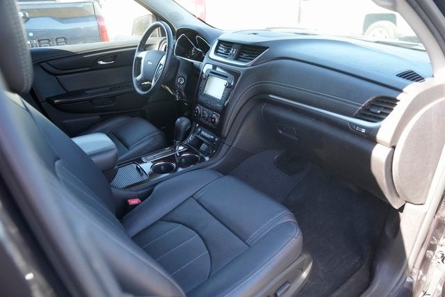 This 2017 Chevrolet Traverse Premier in Tungsten Metallic comes with the following features: 3.6L V6 SIDI 6-Speed Automatic AWD Memory Package, Traverse Premier, 4D Sport Utility, 3.6L V6 SIDI, 6-Speed Automatic, AWD, Tungsten Metallic, Ebony w/Perforated Leather-Appointed Seat Trim, 10 Speakers, 20 x 7.5 Machined Aluminum Wheels, 3.16 Axle Ratio, 3rd row seats: split-bench, 4-Wheel Disc Brakes, 7-Passenger Seating (2-2-3 Seating Configuration), 8-Way Power Driver Seat, 8-Way Power Passenger Seat Adjuster, ABS brakes, Air Conditioning, Alloy wheels, AM/FM radio: SiriusXM, Auto-dimming door mirrors, Auto-Dimming Inside Rear-View Mirror, Auto-dimming Rear-View mirror, Automatic temperature control, Bluetooth® For Phone, Body-Color Moldings w/Chrome Bodyside Accents, Bodyside moldings, Bose Premium 10-Speaker Audio System Feature, Brake assist, Bumpers: body-color, CD player, Color Touch Navigation System, Compass, Delay-off headlights, Driver door bin, Driver vanity mirror, Dual Exhaust w/Bright Tips, Dual front impact airbags, Dual front side impact airbags, Electronic Stability Control, Emergency communication system, Enhanced Driver Information Center, Exterior Parking Camera Rear, Forward Collision Alert & Lane Departure Warning, Four wheel independent suspension, Front anti-roll bar, Front Bucket Seats, Front Center Armrest w/Storage, Front dual zone A/C, Front Fog Lamps, Front fog lights, Front reading lights, Frontal & Side-Impact Airbags, Fully automatic headlights, Garage door transmitter, Heated & Cooled Driver & Front Passenger Seats, Heated door mirrors, Heated front seats, Heated Steering Wheel, Heated steering wheel, Illuminated entry, Interior Wood Grain Center Stack & Interior Trim, Leather Shift Knob, Leather-Wrapped Steering Wheel, Low tire pressure warning, Memory seat, Navigation System, NavTraffic, Occupant sensing airbag, Outside temperature display, Overhead airbag, Panic alarm, Passenger door bin, Passenger vanity mirror, Perforated Leather-Appointed Seat Trim, Power door mirrors, Power driver seat, Power Liftgate, Power passenger seat, Power steering, Power windows, Power Windows w/Driver Express-Up & Down, Power-Folding Heated Body-Color Outside Mirrors, Premium audio system: Chevrolet MyLink, Radio data system, Radio: Chevrolet MyLink AM/FM Stereo w/CD & NAV, Rear air conditioning, Rear anti-roll bar, Rear audio controls, Rear Audio System Controls, Rear Park Assist, Rear Power Liftgate, Rear reading lights, Rear window defroster, Rear window wiper, Remote keyless entry, Remote Vehicle Start, Roof rack: rails only, Security system, Side Blind Zone Alert & Rear Cross Traffic Alert, SiriusXM Satellite Radio, Speed control, Speed-sensing steering, Spoiler, Steering wheel mounted audio controls, Tachometer, Telescoping steering wheel, Tilt steering wheel, Traction control, Tri-Zone Automatic Climate Control, Trip computer, Turn signal indicator mirrors, Universal Home Remote, Variable Effort Power Steering, Variably intermittent wipers, Ventilated front seats, and Voltmeter.