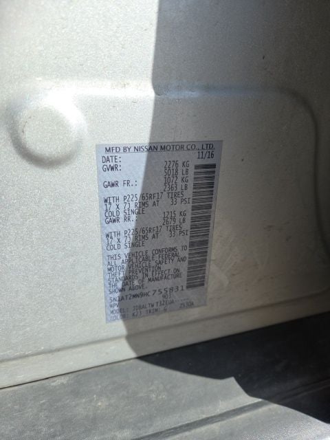 This 2017 Nissan Rogue SV in Brilliant Silver comes with the following features: 2.5L I4 DOHC 16V CVT with Xtronic FWD SV Family Package (3rd Row Seating and Run Flat Tires), SV Premium Package (Around View Monitor, Motion Activated Liftgate, and Radio: AM/FM/CD/AUX NissanConnect w/Navigation), 17 Aluminum Alloy Wheels, 4-Wheel Disc Brakes, 5.694 Axle Ratio, 6 Speakers, ABS brakes, Air Conditioning, Alloy wheels, AM/FM radio: SiriusXM, Anti-whiplash front head restraints, Automatic temperature control, Blind Spot Warning, Brake assist, Bumpers: body-color, CD player, Cloth Seat Trim, Delay-off headlights, Driver door bin, Driver vanity mirror, Dual front impact airbags, Dual front side impact airbags, Electronic Stability Control, Floor Mats & 5-PC Cargo Area Protector, Four wheel independent suspension, Front anti-roll bar, Front Bucket Seats, Front Center Armrest w/Storage, Front dual zone A/C, Front reading lights, Fully automatic headlights, Heated door mirrors, Heated front seats, Illuminated entry, Leather Shift Knob, Low tire pressure warning, Occupant sensing airbag, Outside temperature display, Overhead airbag, Overhead console, Panic alarm, Passenger door bin, Passenger vanity mirror, Power door mirrors, Power driver seat, Power steering, Power windows, Quick Comfort Heated Front Bucket Seats, Radio data system, Radio: AM/FM/CD/AUX, Rear anti-roll bar, Rear seat center armrest, Rear window defroster, Rear window wiper, Remote keyless entry, Retractable Cargo Cover, Roof rack: rails only, Security system, Speed control, Speed-sensing steering, Split folding rear seat, Spoiler, Steering wheel mounted audio controls, Tachometer, Telescoping steering wheel, Tilt steering wheel, Traction control, Trip computer, Turn signal indicator mirrors, and Variably intermittent wipers.