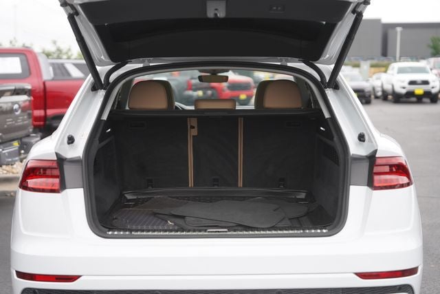 This 2020 Audi Q8 55 Premium Plus quattro in Glacier White Metallic comes with the following features: 3.0L V6 Turbocharged DOHC 24V LEV3-ULEV125 335hp 8-Speed Automatic with Tiptronic quattro Q8 55 Premium Plus quattro, 4D Sport Utility, 3.0L V6 Turbocharged DOHC 24V LEV3-ULEV125 335hp, 8-Speed Automatic with Tiptronic, quattro, Glacier White Metallic, Saiga Beige w/Leather Seating Surfaces or Valcona Leather Seat Trim, 10 Speakers, 4-Wheel Disc Brakes, ABS brakes, Adaptive suspension, Air Conditioning, Alloy wheels, AM/FM radio: SiriusXM, Audi smartphone interface (Apple CarPlay/Android Auto), Auto High-beam Headlights, Auto-dimming Rear-View mirror, Automatic temperature control, Axle Ratio: TBA, Brake assist, Bumpers: body-color, Compass, Delay-off headlights, Driver door bin, Driver vanity mirror, Dual front impact airbags, Dual front side impact airbags, Electronic Stability Control, Emergency communication system: Audi connect CARE, PRIME & PLUS, Exterior Parking Camera Rear, Four wheel independent suspension, Front anti-roll bar, Front Bucket Seats, Front Center Armrest, Front dual zone A/C, Front fog lights, Front reading lights, Fully automatic headlights, Garage door transmitter: HomeLink, Genuine wood door panel insert, Heated door mirrors, Heated Front Bucket Seats, Heated front seats, Illuminated entry, Leather Seating Surfaces, Leather Shift Knob, Leather steering wheel, Low tire pressure warning, Memory seat, Navigation System, Occupant sensing airbag, Outside temperature display, Overhead airbag, Overhead console, Panic alarm, Passenger door bin, Passenger vanity mirror, Power door mirrors, Power driver seat, Power Liftgate, Power moonroof, Power passenger seat, Power steering, Power windows, Radio data system, Radio: Audi MMI Navigation Plus w/Touch Response, Rain sensing wipers, Rear air conditioning, Rear anti-roll bar, Rear fog lights, Rear reading lights, Rear seat center armrest, Rear window defroster, Rear window wiper, Remote keyless entry, Roof rack: rails only, Security system, Speed control, Speed-sensing steering, Split folding rear seat, Spoiler, Steering wheel memory, Steering wheel mounted audio controls, Tachometer, Telescoping steering wheel, Tilt steering wheel, Traction control, Trip computer, Turn signal indicator mirrors, Variably intermittent wipers, and Wheels: 20 5-Arm Design.