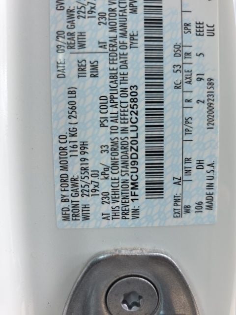 This 2020 Ford Escape Hybrid Titanium in White Metallic comes with the following features: 2.5L iVCT eCVT AWD Equipment Group 400A (Pedestrian Alert Sounder and Wireless Charging Pad), Titanium Premium Package 2.0 (110V/150W AC Power Outlet, Black Roof-Rack Side Rails, Head-Up Display, and Panoramic Vista Roof), 10 Speakers, 2.91 Axle Ratio, 4-Wheel Disc Brakes, ABS brakes, Air Conditioning, Alloy wheels, AM/FM radio: SiriusXM, Auto High-beam Headlights, Auto-dimming Rear-View mirror, Automatic temperature control, Brake assist, Bumpers: body-color, Compass, Delay-off headlights, Driver door bin, Driver vanity mirror, Dual front impact airbags, Dual front side impact airbags, Electronic Stability Control, Emergency communication system: SYNC 3 911 Assist, Exterior Parking Camera Rear, FordPass Connect, Four wheel independent suspension, Front anti-roll bar, Front Bucket Seats, Front Center Armrest, Front dual zone A/C, Front fog lights, Front License Plate Bracket, Front reading lights, Fully automatic headlights, Garage door transmitter, Heated door mirrors, Heated front seats, Heated Leather-Trimmed Front Sport Contour Seats, Heated steering wheel, Illuminated entry, Knee airbag, Leather steering wheel, Low tire pressure warning, Memory seat, Navigation System, Occupant sensing airbag, Outside temperature display, Overhead airbag, Overhead console, Panic alarm, Passenger door bin, Passenger vanity mirror, Power door mirrors, Power driver seat, Power Liftgate, Power passenger seat, Power steering, Power windows, Radio data system, Radio: B&O Sound System by Bang & Olufsen, Rain sensing wipers, Rear anti-roll bar, Rear reading lights, Rear seat center armrest, Rear window defroster, Rear window wiper, Remote keyless entry, Security system, Speed control, Speed-sensing steering, Speed-Sensitive Wipers, Split folding rear seat, Spoiler, Steering wheel mounted audio controls, SYNC 3 Communications & Entertainment System, Telescoping steering wheel, Tilt steering wheel, Traction control, Trip computer, Turn signal indicator mirrors, Variably intermittent wipers, Voice-Activated Touchscreen Navigation System, and Wheels: 19 Machined-Face Aluminum.