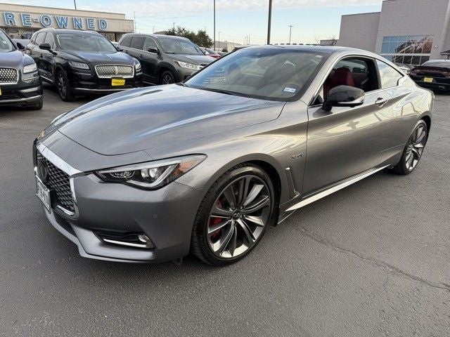 This 2020 INFINITI Q60 Red Sport 400 in Graphite Shadow comes with the following features: 3.0L V6 7-Speed Automatic AWD Cargo Package (Cargo Net, First Aid Kit, and Trunk Protector), 13 Speakers, 4-Wheel Disc Brakes, ABS brakes, Adaptive suspension, Air Conditioning, Alloy wheels, AM/FM radio: SiriusXM, Apple CarPlay/Android Auto, Auto tilt-away steering wheel, Auto-dimming door mirrors, Auto-dimming Rear-View mirror, Automatic temperature control, Blind Spot Warning, Brake assist, Bumpers: body-color, CD player, Compass, Delay-off headlights, Driver door bin, Driver vanity mirror, Dual front impact airbags, Dual front side impact airbags, Electronic Stability Control, Four wheel independent suspension, Front anti-roll bar, Front Bucket Seats, Front Center Armrest, Front dual zone A/C, Front fog lights, Front reading lights, Fully automatic headlights, Garage door transmitter: HomeLink, Heated door mirrors, Heated Front Bucket Seats, Heated front seats, Heated steering wheel, Illuminated entry, Illuminated Kick Plates, Leather Shift Knob, Leather steering wheel, Literature Kit, Low tire pressure warning, Memory seat, Navigation system: INFINITI InTouch Navigation, Occupant sensing airbag, Outside temperature display, Overhead airbag, Overhead console, Panic alarm, Passenger door bin, Passenger vanity mirror, Power door mirrors, Power driver seat, Power moonroof, Power passenger seat, Power steering, Power windows, Radio data system, Radio: AM/FM/HD w/Navigation, Rain sensing wipers, Rear anti-roll bar, Rear window defroster, Remote keyless entry, Security system, Semi-Aniline Leather-Appointed Seating Surfaces, Speed control, Speed-sensing steering, Speed-Sensitive Wipers, Steering wheel memory, Steering wheel mounted audio controls, Tachometer, Telescoping steering wheel, Tilt steering wheel, Traction control, Trip computer, Turn signal indicator mirrors, Variably intermittent wipers, and Wheels: 20 Aluminum-Alloy Sport.