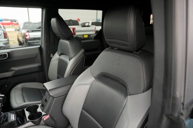 This 2021 Ford Bronco Black Diamond in Area 51 comes with the following features: 2.3L EcoBoost I-4 7-Speed Manual 4WD Bronco Black Diamond, 4D Sport Utility, 2.3L EcoBoost I-4, 7-Speed Manual, 4WD, Area 51, Dark Gray W/Black Onyx Vinyl, 4-Wheel Disc Brakes, 6 Speakers, ABS brakes, Air Conditioning, AM/FM radio: SiriusXM with 360L, AM/FM Stereo, Auto High-beam Headlights, Brake assist, Cargo Area Protector, Compass, Delay-off headlights, Driver door bin, Driver vanity mirror, Dual front impact airbags, Dual front side impact airbags, Emergency communication system: 911 Assist, Exterior Parking Camera Rear, Front & Rear Floor Liners, Front anti-roll bar, Front Bucket Seats, Front Center Armrest, Front reading lights, Front wheel independent suspension, Fully automatic headlights, Heated door mirrors, Illuminated entry, Integrated roll-over protection, Keyless Entry Keypad, Low tire pressure warning, Occupant sensing airbag, Outside temperature display, Overhead airbag, Overhead console, Panic alarm, Passenger door bin, Passenger vanity mirror, Power door mirrors, Power steering, Power windows, Radio data system, Remote keyless entry, Security system, SiriusXM Radio w/360L, Speed control, Split folding rear seat, Steering wheel mounted audio controls, SYNC 4, Tachometer, Telescoping steering wheel, Tilt steering wheel, Traction control, Trip computer, and Variably intermittent wipers.