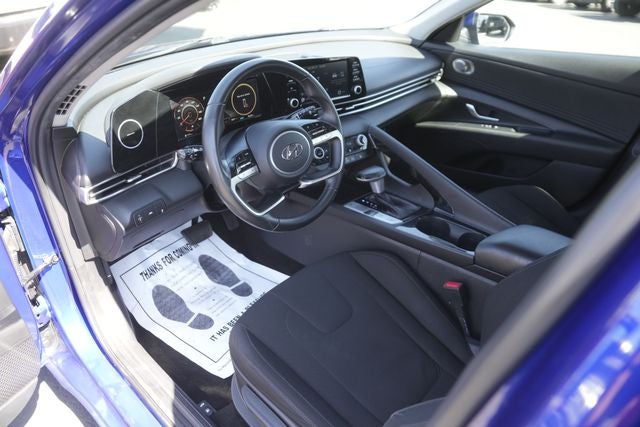 This 2021 Hyundai Elantra SEL in Intense Blue comes with the following features: 2.0L 4-Cylinder DOHC 16V CVT FWD Convenience Package (Electronic Parking Brake, Forward Collision Avoidance Assist, Full 10.25 LCD TFT Cluster, Heated Front Seats, Heated Outside Mirrors, Leather-Wrapped Steering Wheel, Option Group 02, Smart Cruise Control w/Stop & Go, and Wireless Device Charging), Elantra SEL, 4D Sedan, 2.0L 4-Cylinder DOHC 16V, CVT, FWD, Intense Blue, Black Cloth, 16 x 6.5J Alloy Wheels, 4-Wheel Disc Brakes, 6 Speakers, ABS brakes, Air Conditioning, Alloy wheels, AM/FM radio: SiriusXM, Apple CarPlay & Android Auto, Auto High-beam Headlights, Automatic temperature control, Brake assist, Bumpers: body-color, Carpeted Floor Mats, Cloth Seat Trim, Delay-off headlights, Driver door bin, Driver vanity mirror, Dual front impact airbags, Dual front side impact airbags, Electronic Stability Control, Emergency communication system: Blue Link Connected Car Service (3-year complimentary subscription), Exterior Parking Camera Rear, Front anti-roll bar, Front Bucket Seats, Front Center Armrest, Front dual zone A/C, Front reading lights, Front wheel independent suspension, Fully automatic headlights, Illuminated entry, Low tire pressure warning, Occupant sensing airbag, Outside temperature display, Overhead airbag, Overhead console, Panic alarm, Passenger door bin, Passenger vanity mirror, Power door mirrors, Power steering, Power windows, Radio: AM/FM/HD/SiriusXM Display Audio, Rear window defroster, Remote keyless entry, Security system, Speed control, Speed-sensing steering, Steering wheel mounted audio controls, Tachometer, Telescoping steering wheel, Tilt steering wheel, Traction control, Trip computer, and Variably intermittent wipers.
