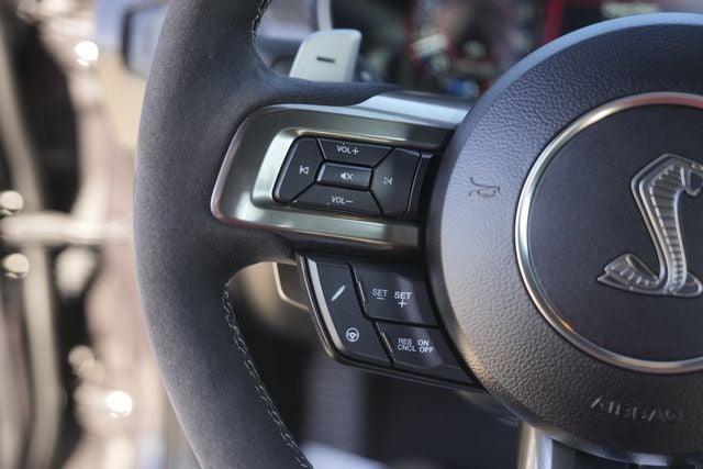 This 2022 Ford Mustang Shelby GT500 in Dark Matter Gray Metallic comes with the following features: 5.2L V8 7-Speed Automatic RWD Equipment Group 950A, Handling Package, Technology Package (BLIS Blind Spot Information System, Heated Mirrors, Radio: B&O Sound System by Bang & Olufsen, and Voice-Activated Touch-Screen Navigation System), Mustang Shelby GT500, 2D Coupe, 5.2L V8, 7-Speed Automatic, RWD, Dark Matter Gray Metallic, Ebony Dove Leather, 20 Wheels, 4-Wheel Disc Brakes, 9 Speakers, ABS brakes, Adaptive suspension, Air Conditioning, Alloy wheels, AM/FM radio: SiriusXM, AM/FM Stereo, Auto-dimming Rear-View mirror, Automatic temperature control, Brake assist, Bumpers: body-color, CD player, Climate Controlled Front Seats, Compass, Delay-off headlights, Driver door bin, Driver vanity mirror, Dual front impact airbags, Dual front side impact airbags, Electronic Stability Control, Emergency communication system: 911 Assist, Exposed Carbon Fiber Instrument Panel, Exterior Parking Camera Rear, Four wheel independent suspension, Front anti-roll bar, Front Bucket Seats, Front Center Armrest, Front dual zone A/C, Front reading lights, Fully automatic headlights, Garage door transmitter, Gray Indoor Car Cover (Dealer Installed), Heated front seats, High-Intensity Discharge Headlights, Illuminated entry, Knee airbag, Kona Blue Over-the-Top Stripe, Leather-Trimmed Sport Seats, Low tire pressure warning, Occupant sensing airbag, Outside temperature display, Overhead airbag, Panic alarm, Passenger door bin, Passenger vanity mirror, Power door mirrors, Power driver seat, Power passenger seat, Power steering, Power windows, Radio data system, Rear anti-roll bar, Rear window defroster, Remote keyless entry, Security system, SiriusXM Radio, Speed control, Speed-sensing steering, Speed-Sensitive Wipers, Split folding rear seat, Spoiler, Sport steering wheel, Steering wheel mounted audio controls, SYNC 3 Communications & Entertainment System, Tachometer, Telescoping steering wheel, Tilt steering wheel, Traction control, Trip computer, Variably intermittent wipers, Ventilated front seats, Voltmeter, and Wheels: 20 Flow Formed High Gloss Black Aluminum.