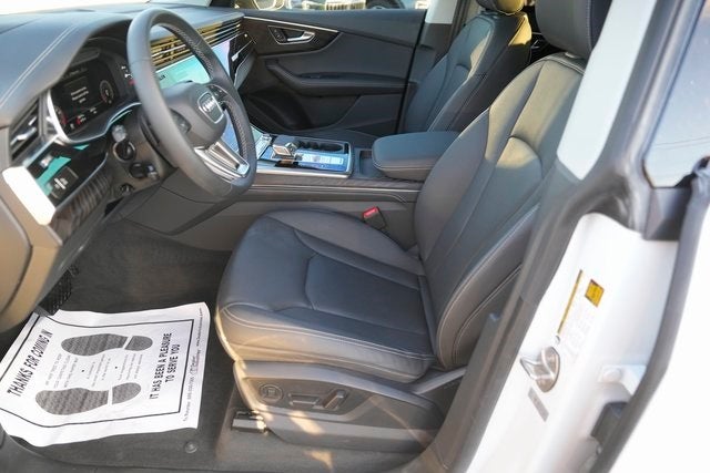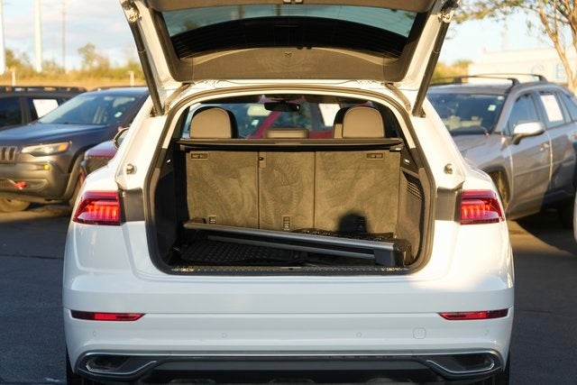 This 2023 Audi Q8 55 Prestige quattro in Glacier White Metallic comes with the following features: 3.0L V6 Turbocharged DOHC 24V LEV3-ULEV70 335hp 8-Speed Automatic with Tiptronic quattro Q8 55 Prestige quattro, Ford Blue Certified Certified, 4D Sport Utility, 3.0L V6 Turbocharged DOHC 24V LEV3-ULEV70 335hp, 8-Speed Automatic with Tiptronic, quattro, Glacier White Metallic, Black w/Leather Seating Surfaces, 10 Speakers, 4-Wheel Disc Brakes, ABS brakes, Adaptive suspension, Air Conditioning, Alloy wheels, AM/FM radio: SiriusXM, Auto High-beam Headlights, Auto-dimming door mirrors, Auto-dimming Rear-View mirror, Automatic temperature control, Axle Ratio: TBD, Brake assist, Bumpers: body-color, Compass, Delay-off headlights, Driver door bin, Driver vanity mirror, Dual front impact airbags, Dual front side impact airbags, Electronic Stability Control, Emergency communication system: Audi connect CARE, Exterior Parking Camera Rear, Four wheel independent suspension, Front anti-roll bar, Front Bucket Seats, Front Center Armrest, Front dual zone A/C, Front fog lights, Front reading lights, Fully automatic headlights, Garage door transmitter: HomeLink, Genuine wood door panel insert, Headlight cleaning, Heated door mirrors, Heated Front Bucket Seats, Heated front seats, Illuminated entry, Leather Seating Surfaces, Leather Shift Knob, Leather steering wheel, Low tire pressure warning, Memory seat, Navigation system: Audi MMI Navigation plus with Touch Response, Occupant sensing airbag, Outside temperature display, Overhead airbag, Overhead console, Panic alarm, Passenger door bin, Passenger vanity mirror, Power door mirrors, Power driver seat, Power Liftgate, Power moonroof: Panoramic, Power passenger seat, Power steering, Power windows, Radio data system, Radio: Audi MMI Nav Plus w/MMI Touch Response, Rain sensing wipers, Rear air conditioning, Rear anti-roll bar, Rear fog lights, Rear reading lights, Rear seat center armrest, Rear side impact airbag, Rear window defroster, Rear window wiper, Remote keyless entry, Security system, Speed control, Speed-sensing steering, Split folding rear seat, Spoiler, Steering wheel memory, Steering wheel mounted audio controls, Tachometer, Telescoping steering wheel, Tilt steering wheel, Traction control, Trip computer, Turn signal indicator mirrors, Variably intermittent wipers, and Wheels: 21 5-Segment-Spoke Design.