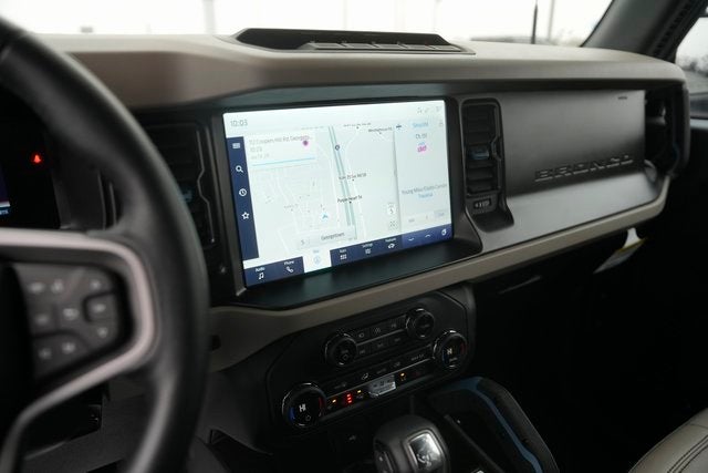 This 2023 Ford Bronco Wildtrak in Azure Gray Metallic Tri-Coat comes with the following features: 2.7L EcoBoost V6 10-Speed Automatic 4WD Bronco Wildtrak, 4D Sport Utility, 2.7L EcoBoost V6, 10-Speed Automatic, 4WD, Azure Gray Metallic Tri-Coat, Black Onyx w/Leather-Trimmed/Vinyl Bucket Seats or Leather-Trimmed/Vinyl Bucket Seats w/Blue/Black, ABS brakes, Compass, Electronic Stability Control, Heated door mirrors, Illuminated entry, Low tire pressure warning, Remote keyless entry, Traction control, 4-Wheel Disc Brakes, 7 Speakers, Air Conditioning, AM/FM radio: SiriusXM with 360L, AM/FM Stereo, Auto High-beam Headlights, Brake assist, Delay-off headlights, Driver door bin, Driver vanity mirror, Dual front impact airbags, Dual front side impact airbags, Emergency communication system: 911 Assist, Exterior Parking Camera Rear, Front anti-roll bar, Front Bucket Seats, Front Center Armrest, Front reading lights, Front wheel independent suspension, Fully automatic headlights, Integrated roll-over protection, Occupant sensing airbag, Outside temperature display, Overhead airbag, Overhead console, Panic alarm, Passenger door bin, Passenger vanity mirror, Power door mirrors, Power steering, Power windows, Radio data system, Security system, SiriusXM Radio w/360L, Speed control, Split folding rear seat, Steering wheel mounted audio controls, SYNC 4, Tachometer, Telescoping steering wheel, Tilt steering wheel, Trip computer, and Variably intermittent wipers.
