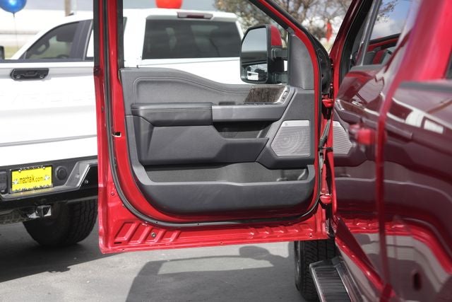 This 2023 Ford F-350SD Lariat in Rapid Red Metallic Tinted Clearcoat comes with the following features: Power Stroke 6.7L V8 DI 32V OHV Turbodiesel 10-Speed Automatic 4WD 5th Wheel/Gooseneck Hitch Prep Package, Camper Package (Rear Stabilizer Bar), Heavy-Service Front Suspension Package, Order Code 618A, F-350 SuperDuty Lariat, 4D Crew Cab, Power Stroke 6.7L V8 DI 32V OHV Turbodiesel, 10-Speed Automatic, 4WD, Rapid Red Metallic Tinted Clearcoat, Black Onyx w/Front Leather-Trimmed 40/Console/40 Seats, 190 Amp Alternator, 4-Wheel Disc Brakes, 410 Amp Dual Alternators, 6 Angular Bright Anodized Step Bars, 8 Speakers, ABS brakes, Adjustable pedals, Air Conditioning, Alloy wheels, AM/FM radio: SiriusXM with 360L, Auto High-beam Headlights, Auto tilt-away steering wheel, Auto-dimming Rear-View mirror, Automatic temperature control, Brake assist, Bumpers: chrome, Compass, Delay-off headlights, Driver door bin, Driver vanity mirror, Dual 68 AH/65 AGM Batteries, Dual front impact airbags, Dual front side impact airbags, Electronic Stability Control, Emergency communication system: SYNC 4 911 Assist, Engine Block Heater, Exterior Parking Camera Rear, Flow-Through Console, Front anti-roll bar, Front Bucket Seats, Front Center Armrest, Front dual zone A/C, Front fog lights, Front Leather-Trimmed 40/Console/40 Seats, Front reading lights, Fully automatic headlights, Garage door transmitter, Gooseneck Hitch Kit (Pre-Installed), Heated door mirrors, Heated front seats, Heated rear seats, Heated steering wheel, Illuminated entry, Leather steering wheel, LED Roof Clearance Lights, Low tire pressure warning, Memory seat, Navigation system: Connected Navigation, Outside temperature display, Overhead airbag, Overhead console, Panic alarm, Passenger door bin, Passenger vanity mirror, Pedal memory, Power door mirrors, Power driver seat, Power passenger seat, Power steering, Power windows, Pro Power Onboard - 2kW, Radio: B&O Sound System by Bang & Olufsen, Rain sensing wipers, Rapid-Heat Supplemental Cab Heater, Rear reading lights, Rear seat center armrest, Rear step bumper, Rear window defroster, Remote keyless entry, Security system, SiriusXM Radio w/360L, Speed control, Split folding rear seat, Steering wheel memory, Steering wheel mounted audio controls, SYNC 4 w/Enhanced Voice Recognition, Tachometer, Tailgate Step & Handle, Telescoping steering wheel, Tilt steering wheel, Traction control, Trip computer, Turn signal indicator mirrors, Upfitter Switches (6), Variably intermittent wipers, Ventilated front seats, and Wheels: 18 Bright Machined & Carbonized Gray Alum.