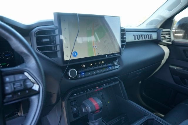 This 2023 Toyota Tundra Hybrid TRD Pro in Midnight Black Metallic comes with the following features: 3.4L V6 10-Speed Automatic 4WD Towing Technology Package, Tundra Hybrid TRD Pro, 4D Crew Cab, 3.4L V6, 10-Speed Automatic, 4WD, Midnight Black Metallic, Black w/SofTex Seat Trim, 12 Speakers, 3.31 Axle Ratio, 4-Wheel Disc Brakes, 400W/120V AC Rear Seat & Bed Power Supply, ABS brakes, Air Conditioning, Alloy wheels, AM/FM radio: SiriusXM, Apple CarPlay/Android Auto, Auto High-beam Headlights, Auto-dimming door mirrors, Auto-dimming Rear-View mirror, Automatic temperature control, Black Dual Exhaust Tips w/Debossed TRD Pro Logo, Brake assist, Bumpers: body-color, Delay-off headlights, Driver door bin, Driver vanity mirror, Dual front impact airbags, Dual front side impact airbags, Electronic Stability Control, Emergency communication system: Safety Connect (10-year trial), Front & Rear Mud Guards, Front anti-roll bar, Front Bucket Seats, Front Center Armrest, Front dual zone A/C, Front fog lights, Front reading lights, Front wheel independent suspension, Fully automatic headlights, Garage door transmitter: HomeLink, Heated & Ventilated Front Bucket Seats, Heated Color-Keyed Outside Mirrors, Heated door mirrors, Heated front seats, Heated steering wheel, Illuminated entry, Knee airbag, Leather Shift Knob, LED Lightbar w/Fog & Marker Lights, Low tire pressure warning, Memory seat, Multi-Terrain Back Monitor, Navigation System, Occupant sensing airbag, Outside temperature display, Overhead airbag, Overhead console, Panic alarm, Passenger door bin, Passenger vanity mirror, Power door mirrors, Power driver seat, Power moonroof, Power Panoramic Roof, Power passenger seat, Power steering, Power windows, Qi-Compatible Wireless Smartphone Charger, Radio data system, Radio: Premium Audio w/JBL, Rear reading lights, Rear seat center armrest, Rear step bumper, Rear window defroster, Remote keyless entry, Security system, Smoked-Finish Premium LED Headlights & DRL, SofTex Seat Trim, Speed control, Speed-sensing steering, Split folding rear seat, Sport steering wheel, Steering wheel mounted audio controls, Tachometer, Telescoping steering wheel, Tilt steering wheel, Traction control, TRD Pro Heated Leather-Trimmed Steering Wheel, Trip computer, Turn signal indicator mirrors, Variably intermittent wipers, Ventilated front seats, Voltmeter, and Wheels: 18 x 8 Black BBS Forged Aluminum.