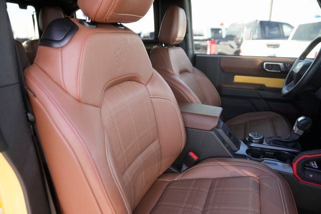 This 2024 Ford Bronco Heritage Limited Edition in Yellowstone comes with the following features: 2.7L EcoBoost V6 10-Speed Automatic 4WD Equipment Group 664A Lux Package, Trailer Tow Package (DIO), Bronco Heritage Limited Edition, 2D Sport Utility, 2.7L EcoBoost V6, 10-Speed Automatic, 4WD, Yellowstone, Black Onyx Leather, 10 Speakers, 4-Wheel Disc Brakes, 4.7 Axle Ratio, ABS brakes, Air Conditioning, Alloy wheels, AM/FM radio: SiriusXM with 360L, Auto High-beam Headlights, Auto-dimming Rear-View mirror, Automatic temperature control, Brake assist, Compass, Connected Navigation, Convertible HardTop, Convertible roof lining, Delay-off headlights, Driver door bin, Driver vanity mirror, Dual front impact airbags, Dual front side impact airbags, Electronic Stability Control, Emergency communication system: 911 Assist, Exterior Parking Camera Rear, Front anti-roll bar, Front Bucket Seats, Front Center Armrest, Front dual zone A/C, Front License Plate Bracket, Front reading lights, Front Row Top Panels & Door Storage Bags, Front wheel independent suspension, Fully automatic headlights, Garage door transmitter, Glass rear window, Heated door mirrors, Heated front seats, Heated steering wheel, Illuminated entry, Integrated roll-over protection, Leather Shift Knob, Leather-Trimmed/Vinyl Heated Bucket Seats, Low tire pressure warning, Navigation system: Connected Navigation, Occupant sensing airbag, Outside temperature display, Overhead airbag, Overhead console, Panic alarm, Passenger door bin, Passenger vanity mirror, Power door mirrors, Power steering, Power windows, Radio data system, Radio: B&O Sound System by Bang & Olufsen, Rear window defroster, Rear window wiper, Remote keyless entry, Security system, SiriusXM Radio w/360L, Speed control, Split folding rear seat, Steering wheel mounted audio controls, SYNC 4, Tachometer, Tailgate Table (DIO), Telescoping steering wheel, Tilt steering wheel, Traction control, Trip computer, Turn signal indicator mirrors, Upgraded Carpet Floor Mats, Variably intermittent wipers, Voltmeter, and Wheels: 17 Black High Gloss-Painted Aluminum.
